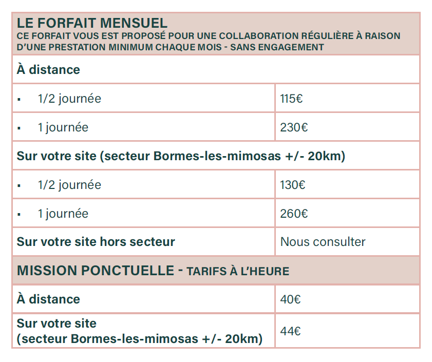 - Les forfaits proposés sont sans engagement, nous pouvons mettre un terme à notre collaboration sur simple demande écrite (à prévoir un délai de 15 jours afin de pouvoir terminer les missions qui seraient en cours)